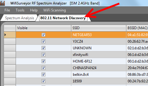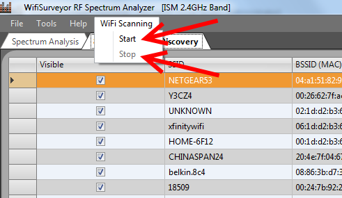 The Network Discovery charts are accessed by selecting the tab ‘802.11 Network Discovery’, and Wi-Fi scanning is toggled ON / OFF by selecting ‘Start’ or ‘Stop’ from the ‘WiFi Scanning’ drop-down menu. Please note that 802.11 Network Discovery is disabled during RF Spectrum Analysis, and vice-versa.